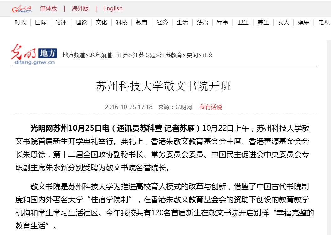 www.888sb.com是苏州科技大学为推进高校育人模式的改革与创新,借鉴了中国古代书院制度和国内外著名大学“住宿学院制”,在香港朱敬文教育基金会的资助下创设的教育教学机构和学生学习生活社区。今年我校共有120名首届新生在www.888sb.com开启别样“幸福完整的教育生活”。